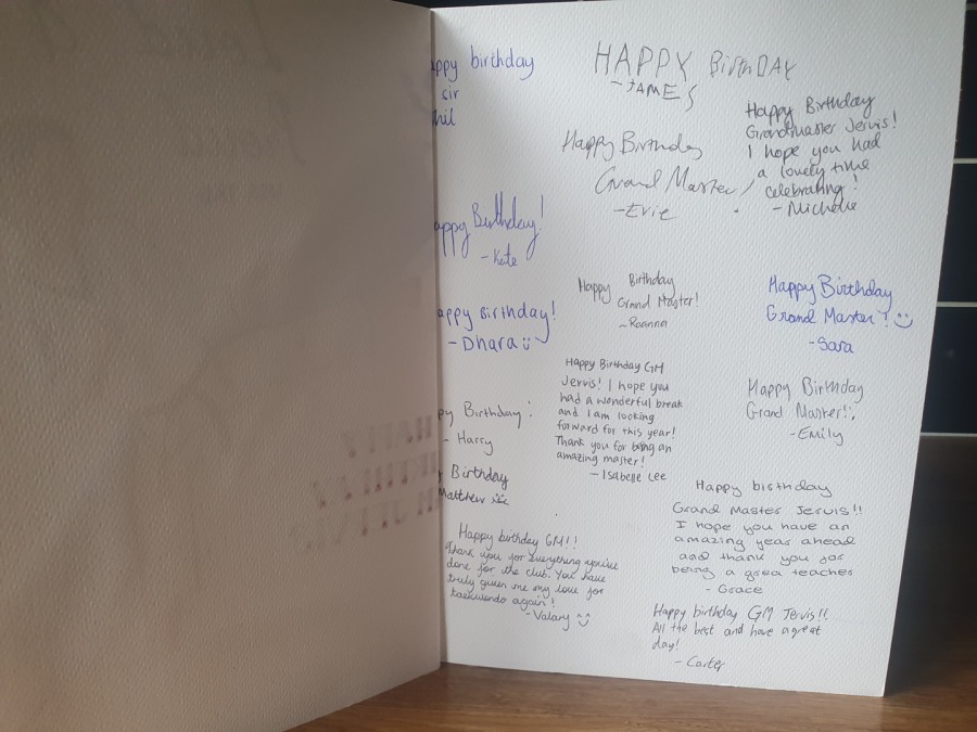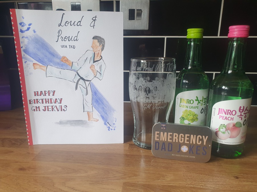 Last year I took over the University Taekwondo club in Norwich . Its a committee run club so i've had reservations about how it would work. A year later and all is well. 47 members. National University medal success including 2 golds and a great relationship with the committee and the students. All committee members also train. Last night at class I was presented with a belated birthday present from the committee members.. 2 bottles of my favourite Korean drink, an engraved glass and a personalised card with some lovely comments. Took me by surprise. The engraving and card have "Loud and Proud" on them...a phrase I use to get them to train hard at each class. So honoured to teach such a lovely group of students.